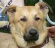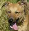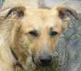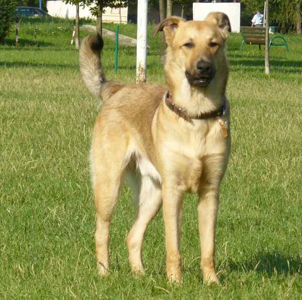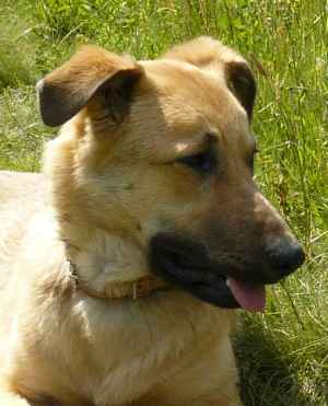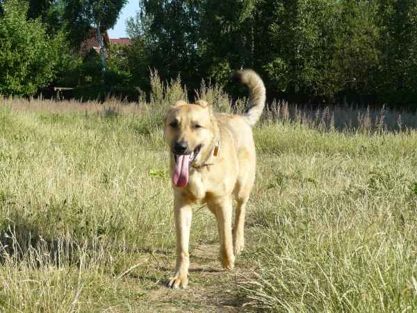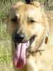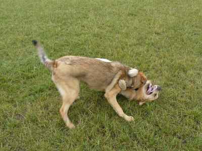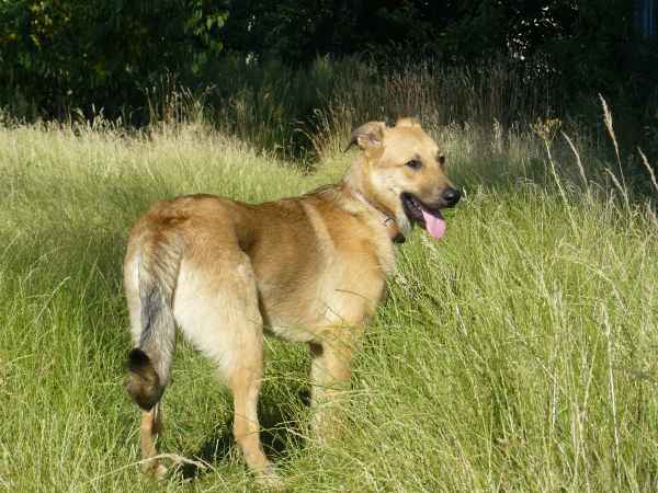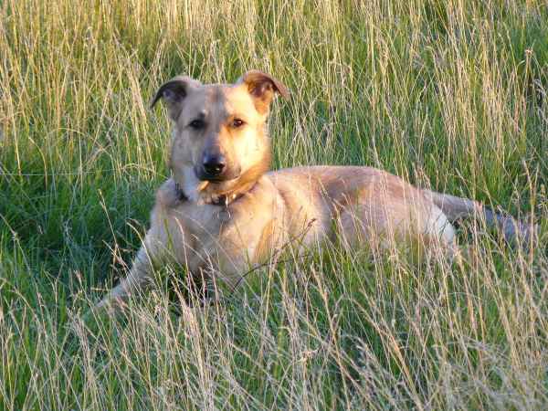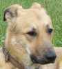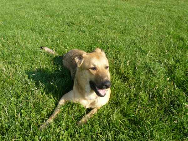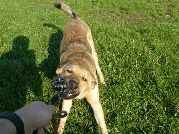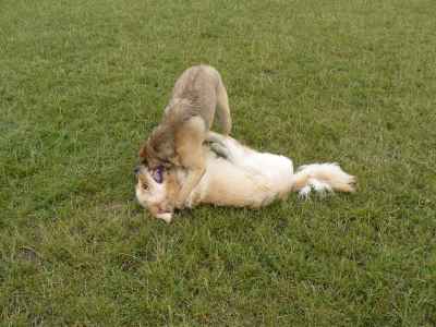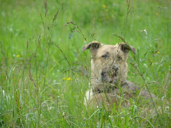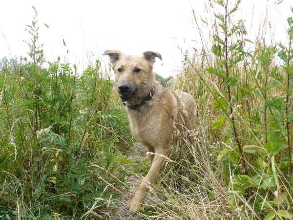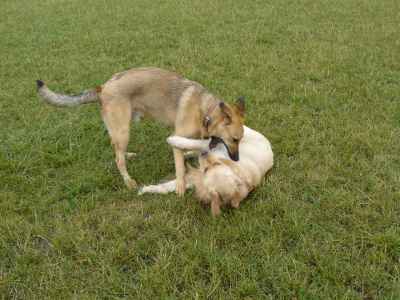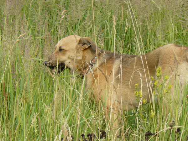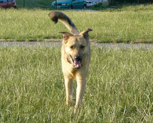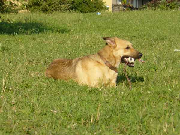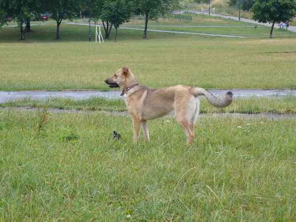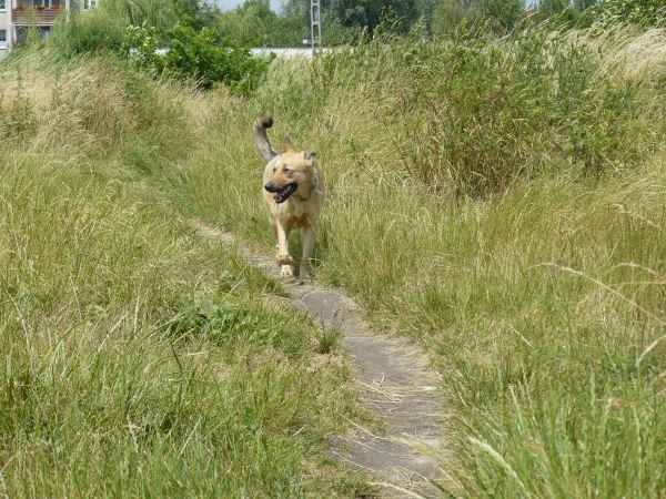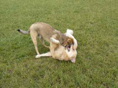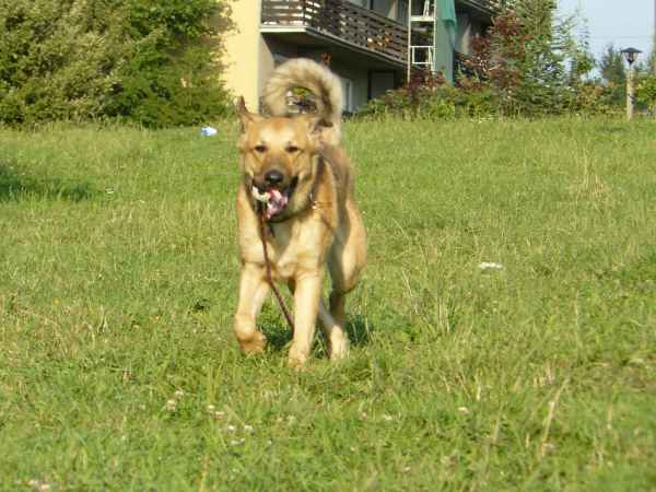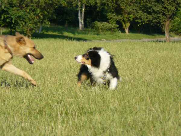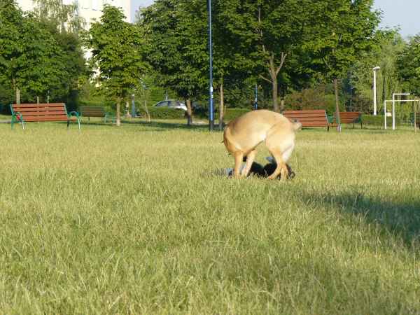 Ruter wypatrujący koleżków.Trafiło się kilku, ale żaden nie rozruszał zbytnio Rutera, bo każdy z nich był na smyczy. Najpierw Nero (mały coli, bez zdjęć w galerii), bardzo skory do zabawy z Ruterem, później Cezar (duży owczarek niemiecki, też jeszcze bez zdjęć w galerii znajomych). Po chwili do grupy dołączyła Tina. Z Tiną jednak zabawa była niezbyt długa, bowiem dzisiaj wolała obgryzać patyka niż gonić z Ruterem. Zabrałem więc Rutera na rundkę wokół dużej łąki (koło kościoła) by wreszcie zrobił to co i tak zrobić musi. Udało się na samym końcu łąki, gdy myślałem że będę musiał z nim spacerować do południa. Wracając jednak tuż przed domem spotkaliśmy nieznanego labradora i Sani. No i zabawa zaczęła się od nowa. Bo dobrej chwili dołączył do nas Bafi wracający już do domu. No, teraz zabawa rozkręciła się na całego.