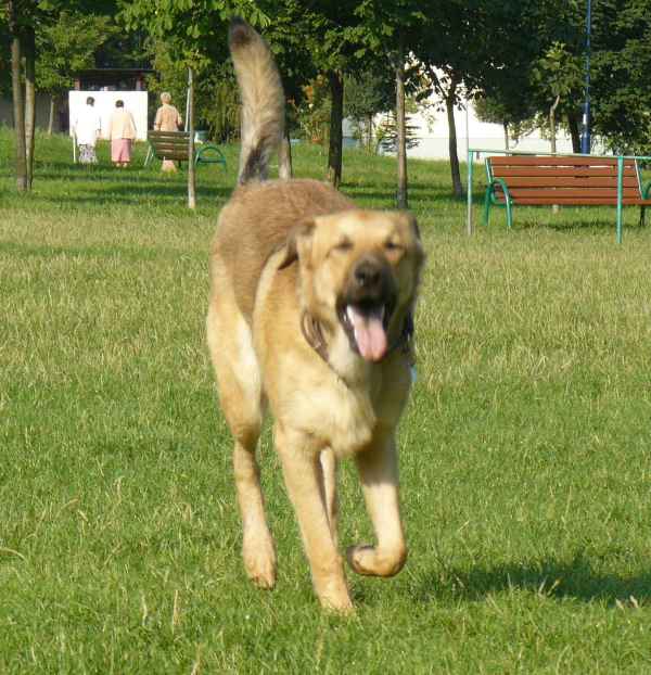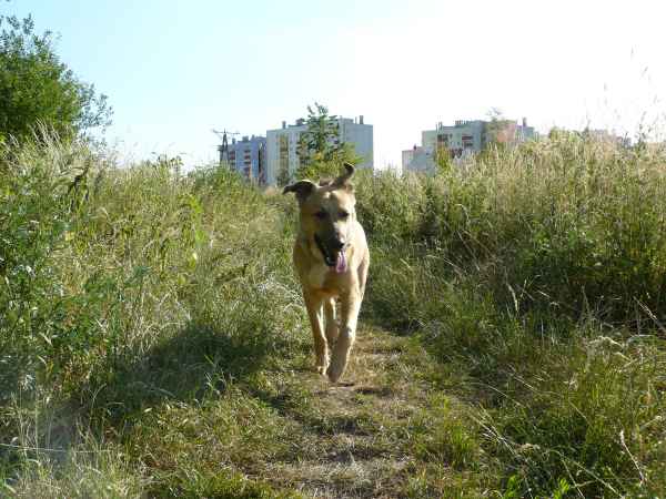 Grzecznie przychodzi na zawołanie.Na wieczorny spacer Ruter obudził mnie z popołudniowej drzemki skomleniem i ciągnięciem za nogi nieco przed 21. Zebrałem się szybko i wyprowadziłem Rutera domyślając się, że wyczuł na dworze koleżków. Niestety Ruter nie uprzedził mnie o fatalnej pogodzie. W efekcie trafiliśmy akurat na rozkręcającą się burzę. Silny porywisty zimny wiatr w połączeniu z siekającym zacinającym deszczem bardzo szybko uświadomił mi że ubrałem się nieodpowiednio. Na szczęście Łukasz poratował mnie zrzucając z balkonu kurtkę. Wtedy jednak towarzystwo psie rozeszło się do domów uciekając przed pogodą i Ruter został sam na środku łąki bardzo niepocieszony.