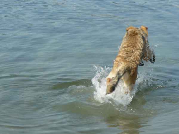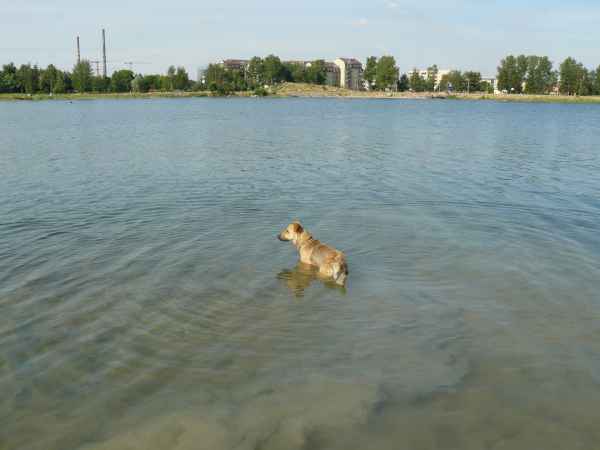 Po chwili już bez smyczy ostrożnie zanurza się coraz bardziej
