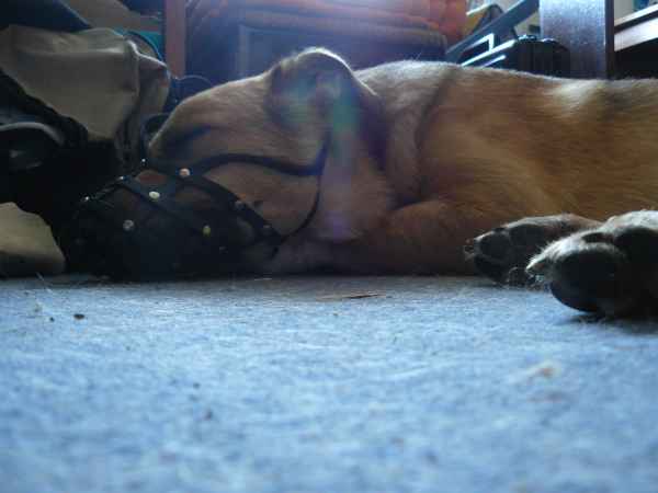 Sama Rana nie była zbyt groźna, więc po jej zdezynfekowaniu Ruter dostał gustowny bandaż na łapkę oraz zastrzyk wzmacniający odporność na infekcję. Niestety po powrocie do domu Ruter natychmiast zabrał się za zrywanie bandaża. W efekcie przez jedną tylko sobotę zawijałem mu łapkę ze cztery razy. Wreszcie zdecydowałem się założyć mu kaganiec aby ochronić łapkę przed zdzieraniem bandaża.