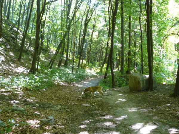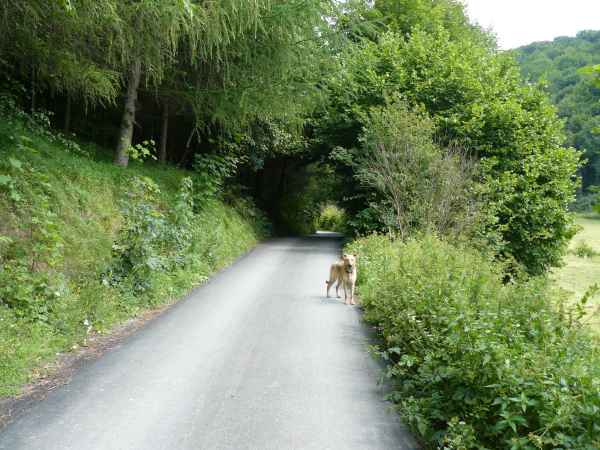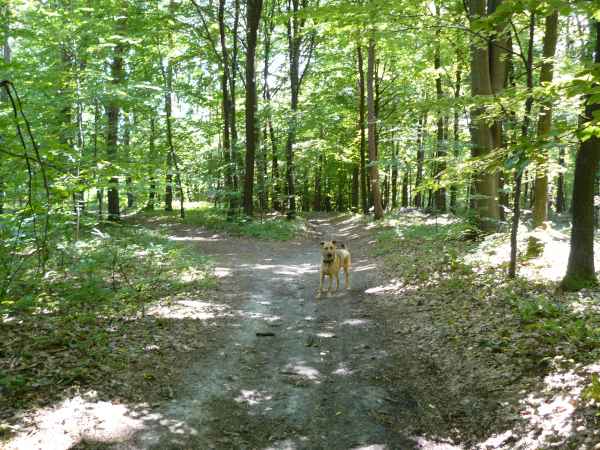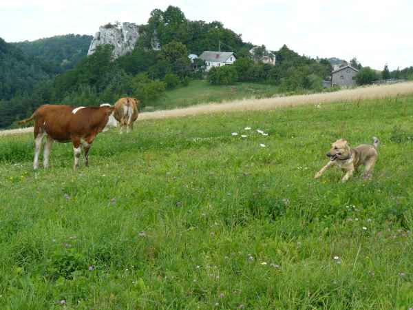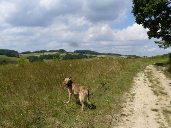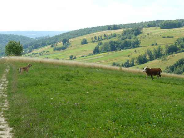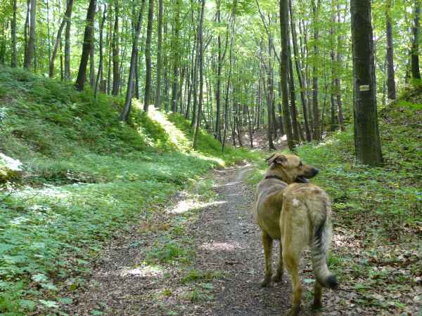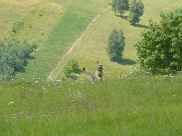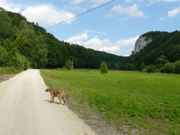 Kończy się Dolinka Racławki.W sumie okazało się, że była to najdłuższa z dotychczasowych wycieczek, bo w ciągu pięciu godzin przeszliśmy około 18 kilometrów. Na trasie trzykrotnie wspinaliśmy się na grzbiet i schodziliśmy do dolinek. Podczas trzeciego podejścia Ruter najwyraźniej miał już dość. Przy każdej najkrótszej chociażby okazji natychmiast kładł się dla odpoczynku. Po powrocie do domu i zjedzeniu obiadu natychmiast zasnął i nie reagował nawet na mój obiad ani nawet na spadające na niego przedmioty. Nie zapomniał jednak o wieczornym spacerze.
