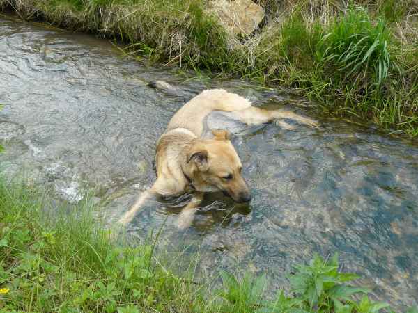 Po hasaniu po łąkach Ruter ochładza się w potoku.