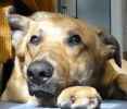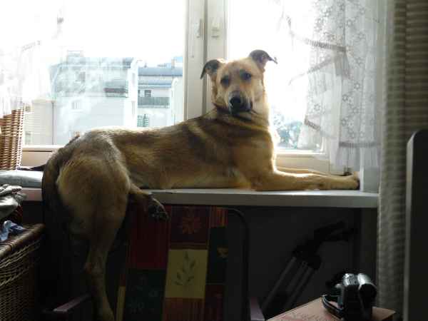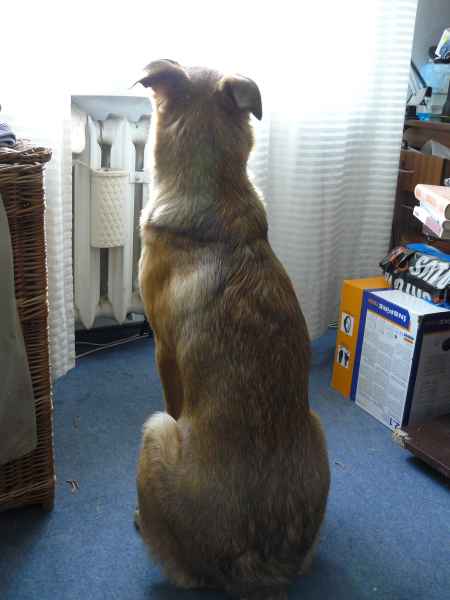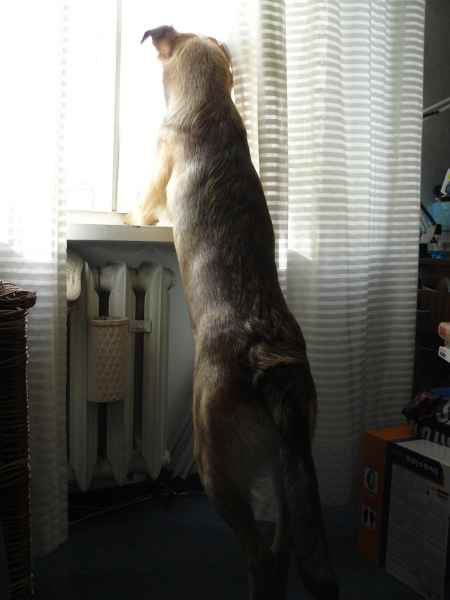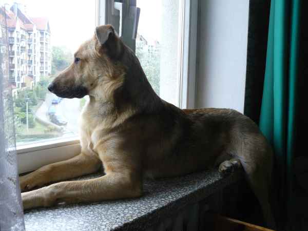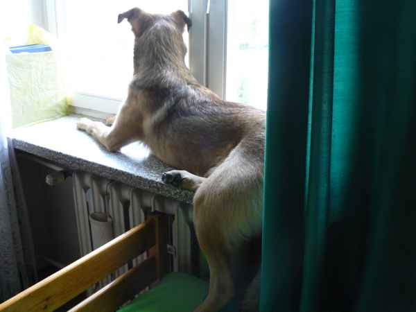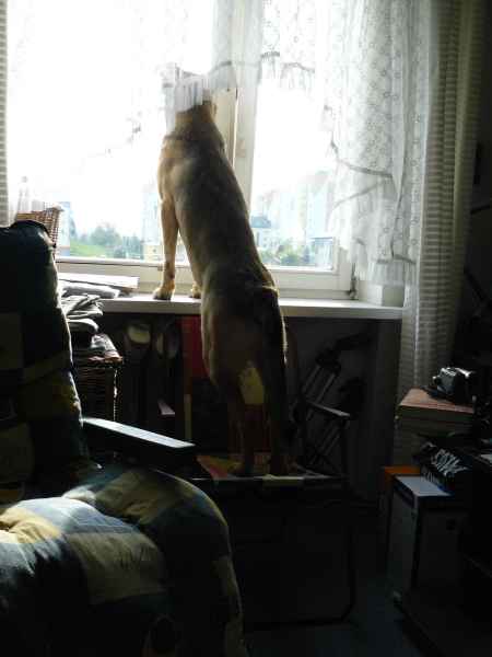 Ruter od rana wyczekuje na spacer. Dzień bardzo pogodny i ciepły, ale Ruter jeszcze na antybiotyku. Dlatego tymczasem siedzimy w domu. Ruter jedynie smutno i tęsknie wygląda przez okno.