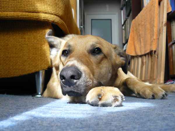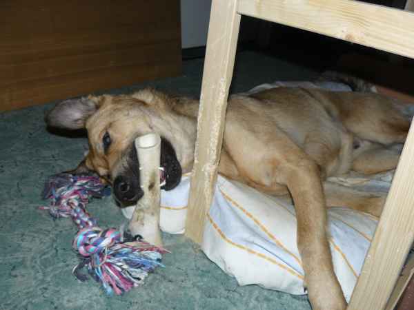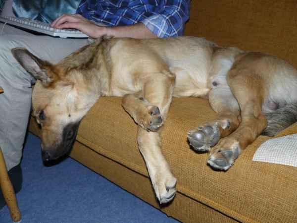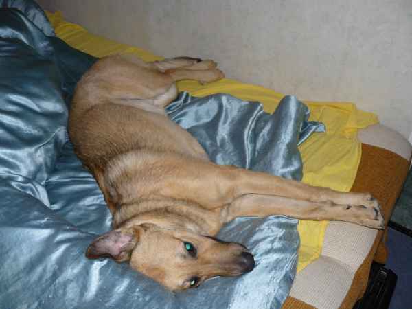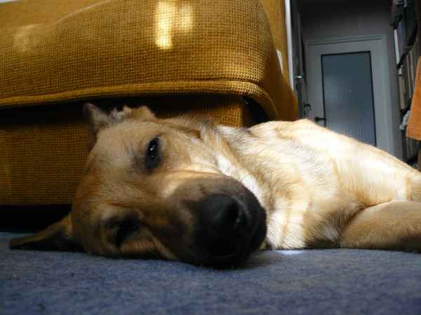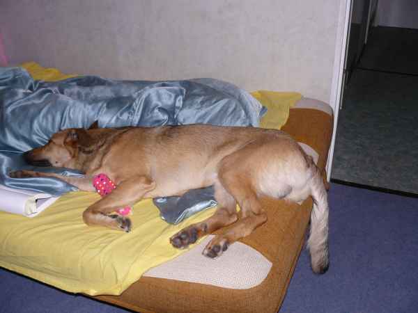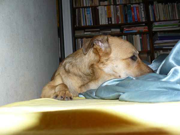 Wszedł w nocy i cicho legł...Po powrocie ze spaceru i, o dziwo, szybkim zjedzeniu śniadania, Ruter się nieco rozruszał. Gdy jednak nie znalazł towarzysza do zabaw wczołgał się na wersalkę i pyskiem toczył piłkę w moją stronę. Zabawa jednak nie mogła trwać zbyt długo...
