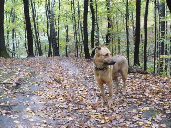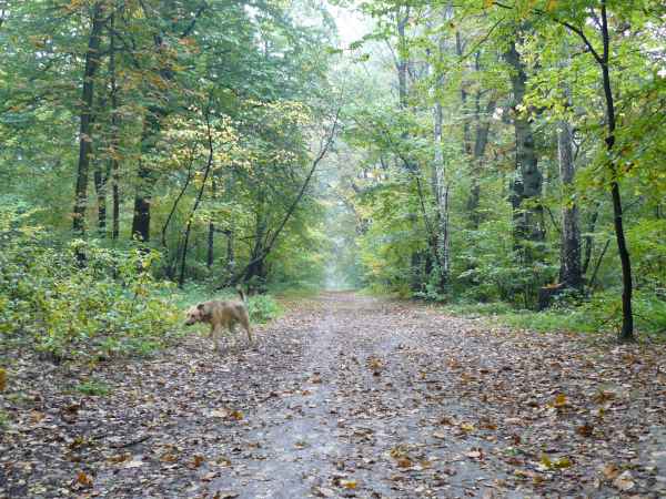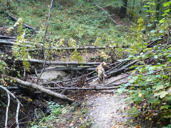 W wąwozie Panieńskich Skał.Przez cały czas Ruter jest bardzo ożywiony. Wbiega do lasu by po chwili wyskoczyć na ścieżkę w pełnym galopie w zupełnie innym miejscu. Skacze, zawraca i znów pędzi przed siebie. Widać że ruch jest spontaniczny, bo w niektórych momentach sam nie może się zdecydować w którym kierunku galopować. W rezultacie co chwila zmienia kierunki wy6wijaąc łapami na wszystkie strony.