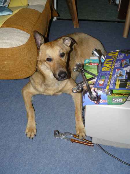 Przebudzenie nad ranem z niespodzianka w łóżku w postaci Rutera.Godzinę później, wykorzystując mój pobyt w łazience, dobrał się do zestawu kluczy i innych narzędzi, które leżały w pokoju. Najwyraźniej nie dawały mu spokoju, bowiem dośc długi nimi manipulował zapewne zastanawiając się: Jak to się robi ?