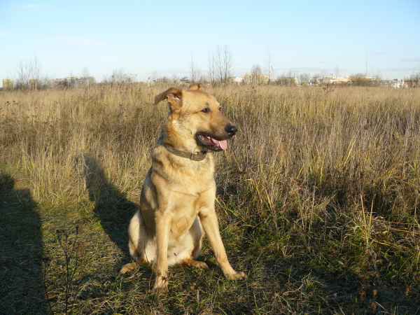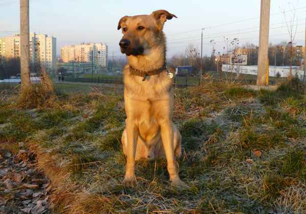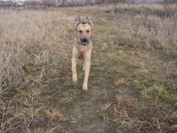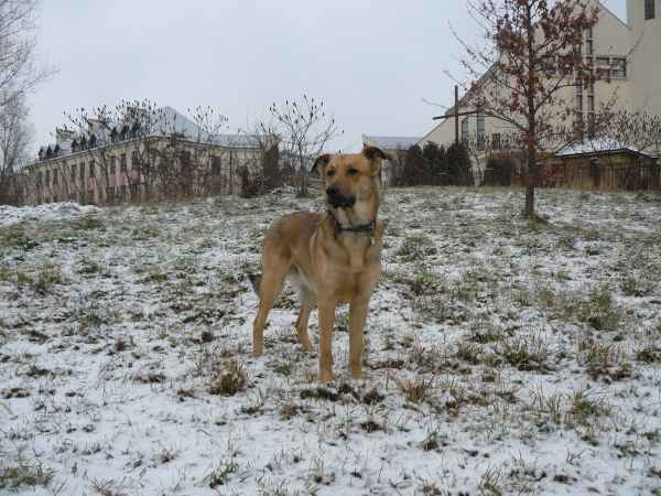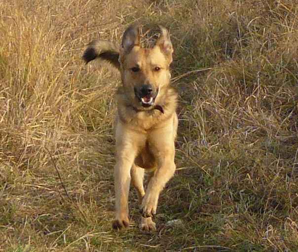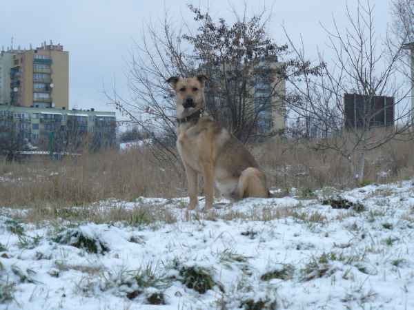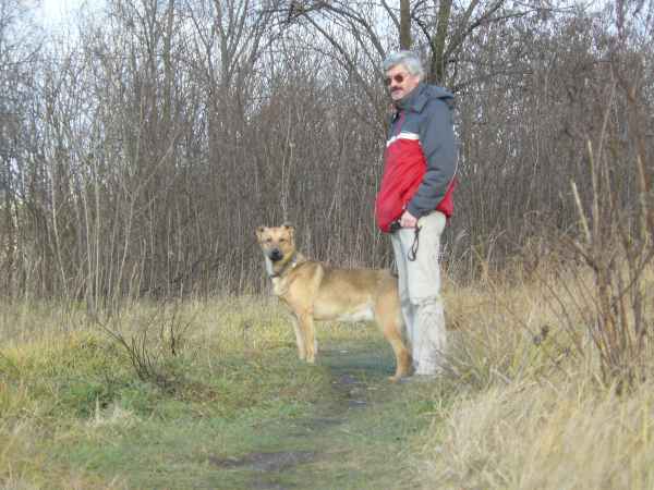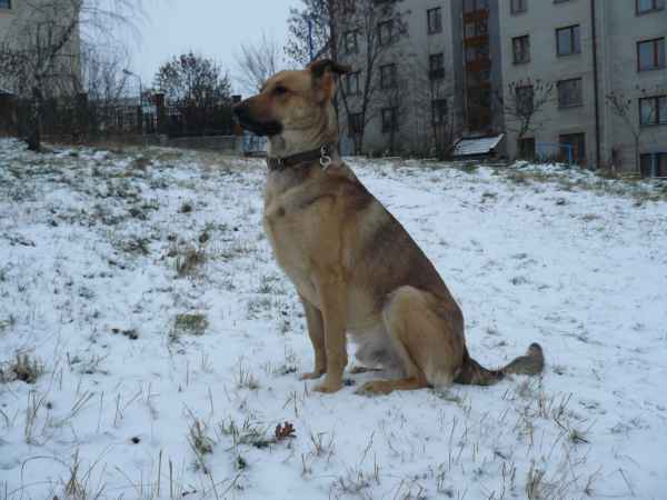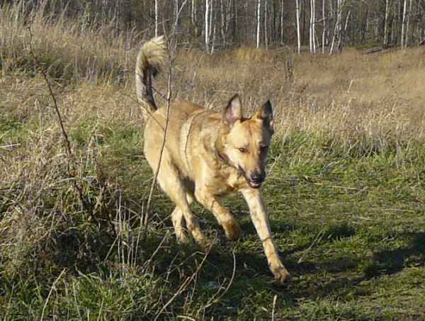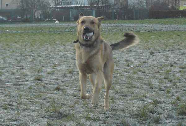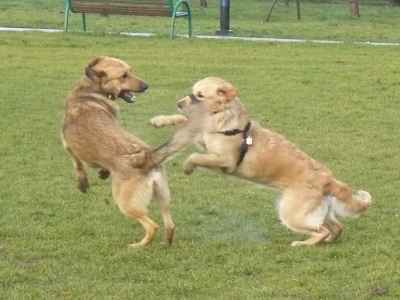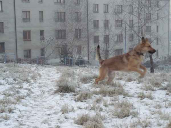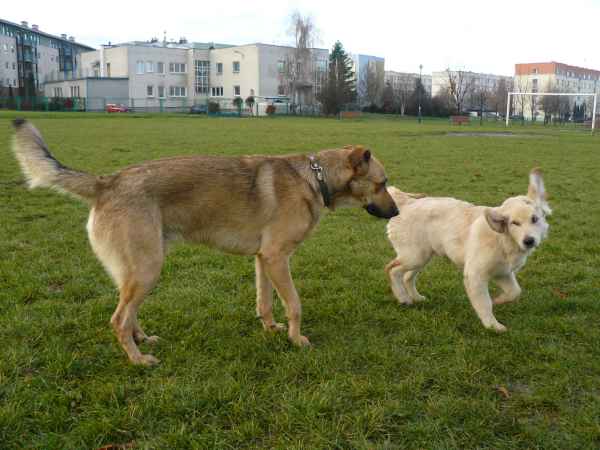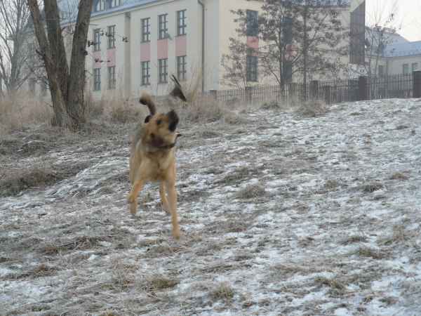 Dziś na porannym spacerze Ruter wreszcie okazał się posłuszny od samego początku do końca. Pomimo iż natychmiast po wyjściu zobaczył na boisku Sani jednak usłuchał mnie i przy nodze grzecznie, acz w wielkiej rozterce, potruchtał za mną na łąkę. Dopiero po kilku minutach ruszyliśmy w dół schodów w kierunku boiska i Ruter cały czas grzecznie szedł koło nogi pomimo iż wydać było jak bardzo go wyrywa w kierunku Sani. Na końcu schodów posłusznie siadł i dopiero wtedy pozwoliłem mu ruszyć na boisku. Pognał galopem jak rakieta.