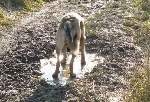 Po wczorajszym wieczornym spacerze Ruter musiał być cały dokładnie wypłukany. Harce z innymi psiakami trwały na boisku ponad godzinę. Okazało się, że poza totalnym wybrudzeniem się w błocie Ruter także coś spałaszował, ponieważ w nocy robił nam pobudkę dwukrotnie. Najpierw musiałem go wyprowadzić tuż po 3-ciej, a później Artur wyprowadził go przed 7-mą. W obu przypadkach Ruter miał gwałtowną potrzebę. Z tego powodu śniadanie Ruterowi dałem dopiero po 11-tej i to w tylko w połowie. Po 12-tej, biorąc pod uwagę wspaniale słoneczną i ciepłą pogodę, postanowiłem przegonić go po Solvayu.