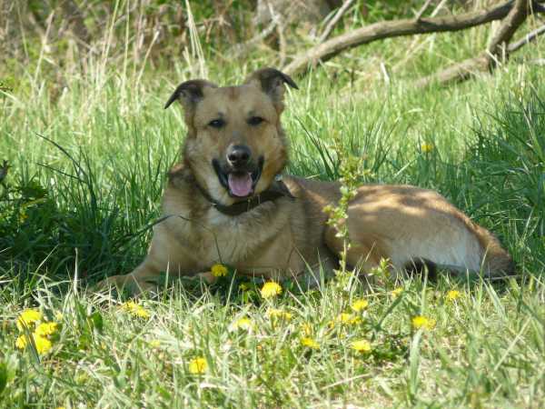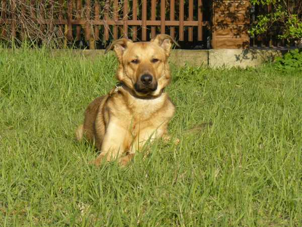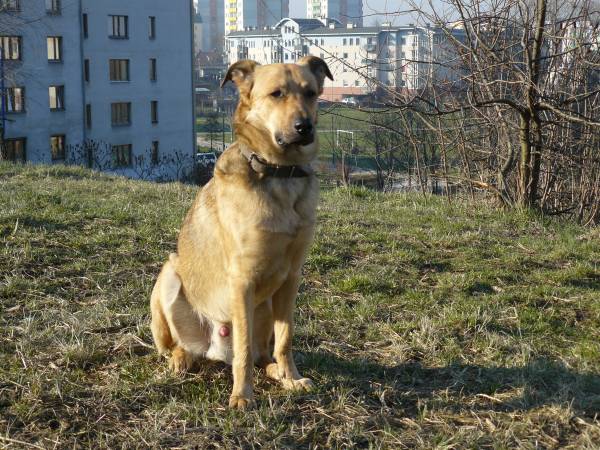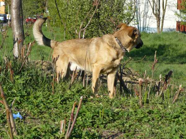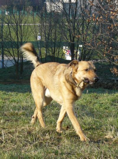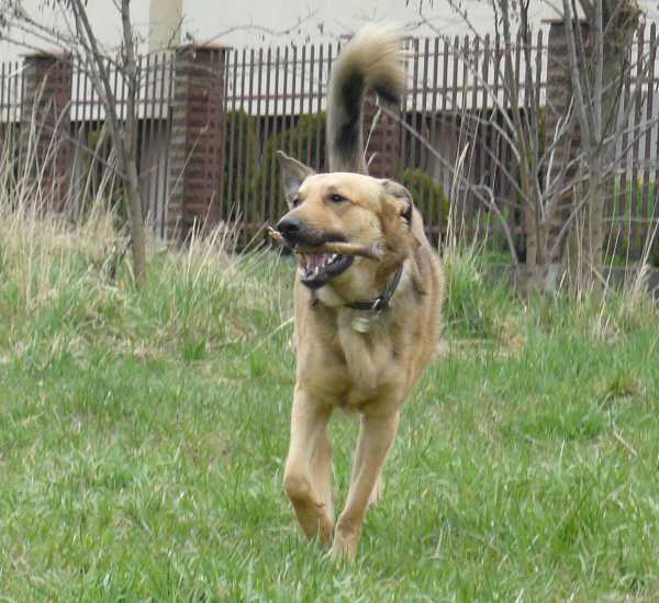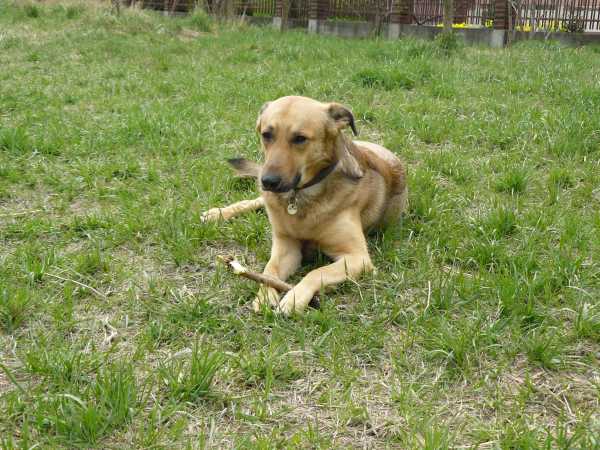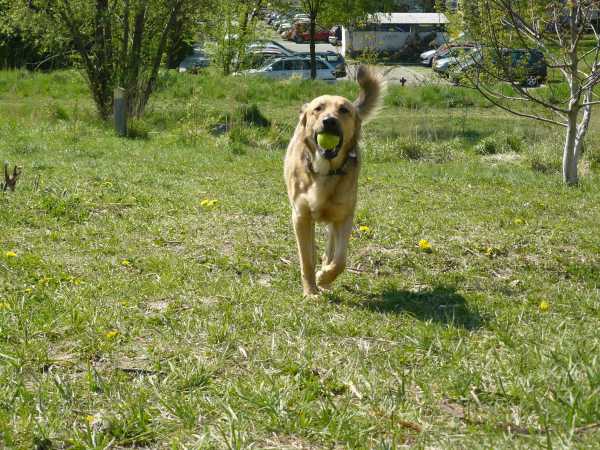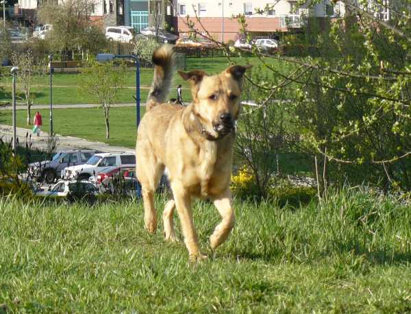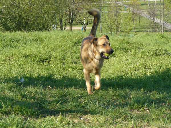 Dziś sobie odpoczywaliśmy. Na popołudniowym spacerze byliśmy na łące osiedlowej. Ruter usiłował zaktywizować mnie piłką. Trochę mu się udało.