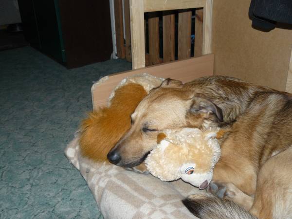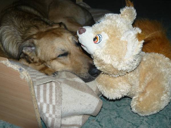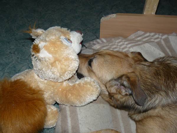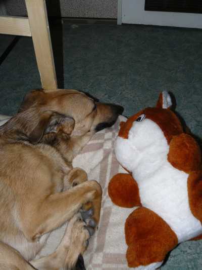 I znowu w tramwaju.Miłość do maskotek wiewiórki ciąg dalszy. Ruter znowu wykradł z pokoju wiewiórkę. Wlókł ją przez pokój, jednak natknął się na przechodzącą Ankę więc natychmiast ją porzucił i położył się do swojego legowiska udając, że o niczym nic nie wie. Anka wzięła wiewiórkę, zaniosła do mojego pokoju, położyła ją na oparciu wersalki i siadła obok. Przeglądaliśmy przez chwilę zdjęcia na komputerze, gdy nagle Anka zorientowała się, że wiewiórki nie ma. Okazało się, że Ruter znów się cichaczem zakradł, i niepostrzeżenie ukradł wiewiórkę zza pleców Anki. Zaintrygowani zaczęliśmy szukać Rutera, i oto co ujrzeliśmy: