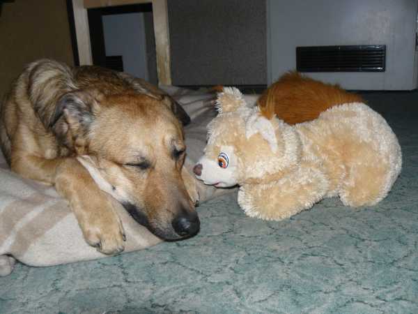 Ruter w swoim legowisku przytulony do odzyskanej wiewiórki.Ruter nie zareagował nawet na robienie zdjęć z lampą błyskową. Nadziwowaliśmy się dobrą chwilę temu widokowi i postanowiliśmy pozostawić mu tę wiewiórkę. Po jakimś czasie okazało się jednak, że Ruter co jakiś czas zmienia ułożenie wiewiórki. Tym razem leżał tak:
