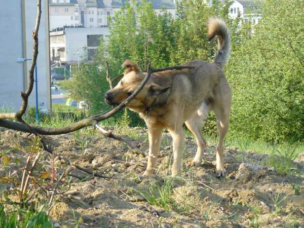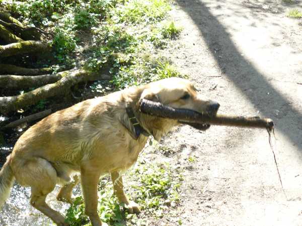 Ruter wciśnięty pod wersalkę.Na popołudniowym spacerze. Dziś na spacerze, w zastępstwie lepszego towarzystwa, dominował patyk.