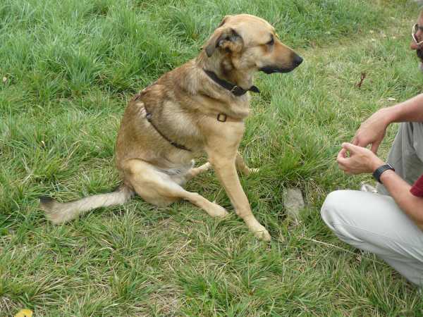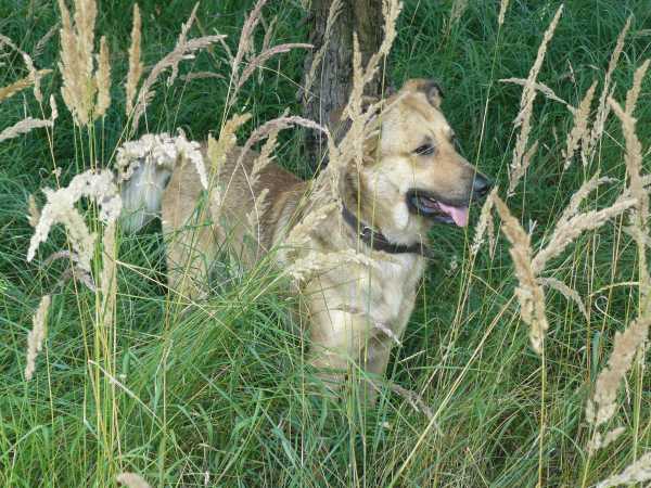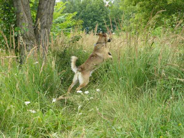 Dziwna pozycja Rutera na łące osiedlowej podczas popołudniowego spaceru.