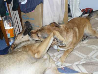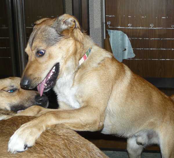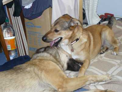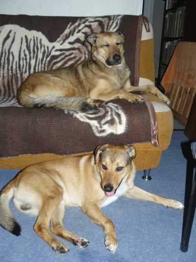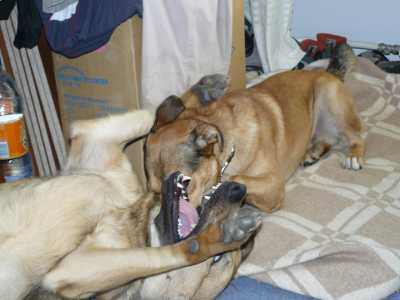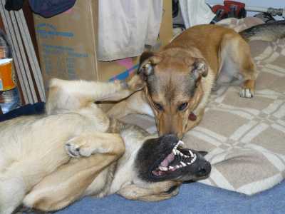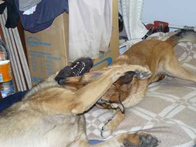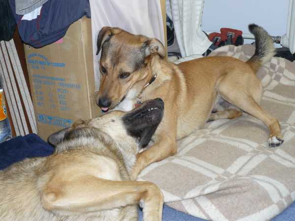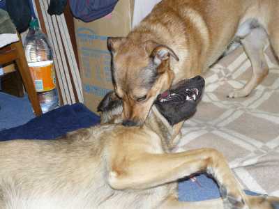 Już po pierwszych harcach z Ruterem, widać że mocno zziajany.Przez cały wieczór psy badały się nawzajem i próbowały swoich możliwości. Pixel, choć wyraźnie mniejszy, jest jednak znacznie bardziej szybki i zdecydowany. Wyglądało na to, że całkowicie podporządkuje sobie Rutera. Późnym wieczorem jednak Ruter zaczął się bronić i momentami przechodził nawet do ataku. Na szczęcie wszystkie te psie przepychanki odbywały się bez zębów i polegały jedynie na skakaniu na siebie. Nie było nawet warczenia.