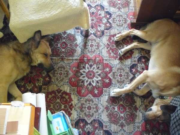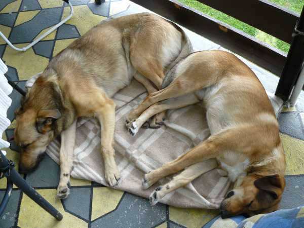 Zgodne spanie na dywanie.Cały dzień minął dość spokojnie. Wygląda na to, że pieski już się dogadały. Skakanie na sobie zdarzało się już tylko sporadycznie. Prawdopodobnie Pixel zrozumiał jaka jest jego pozycja w naszej rodzinie, a Ruter wyczuł, że jego pozycja nie jest zagrożona. Do spania udały się tak jak wczorajszego dnia, choć w nocy Ruter przyczłapał do mojego łóżka. Na razie Pixel ma zakaz wstępu do łóżka, ponieważ jest nieco brudny, a nie chce dać się wykąpać. Ucieka z wanny. W zasadzie jest czysty, widać jak regularnie dokładnie się wylizuje i dba o siebie, ale jednak trochę zalatuje od niego.
