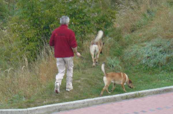 Poranny spacer. Wyprowadzanie równoczesne dwóch psów nie jest wcale takie proste.