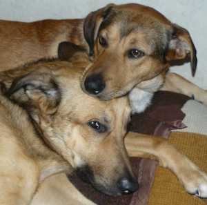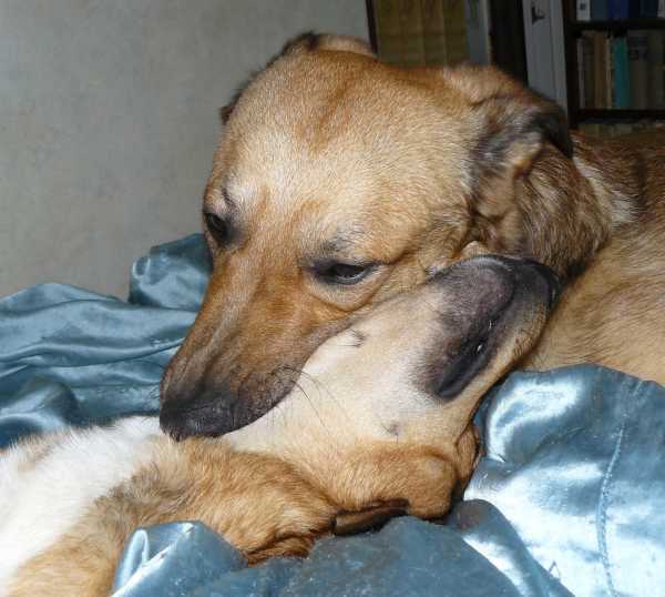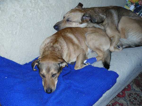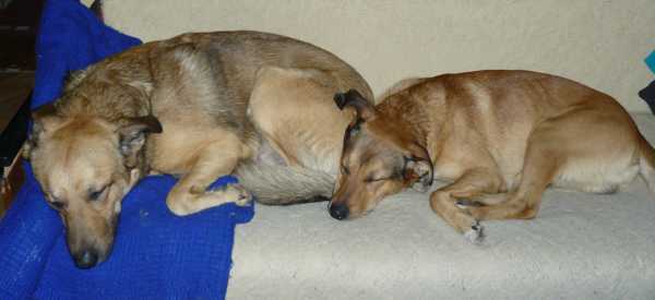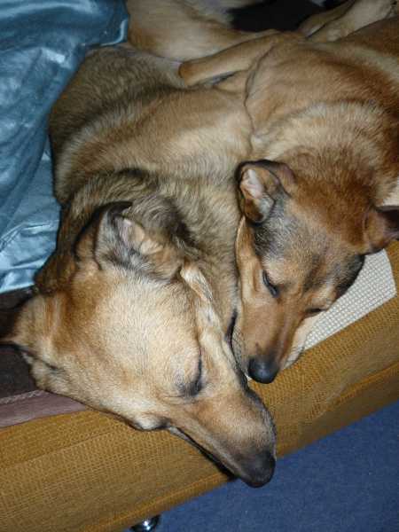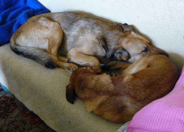 W samo południe psy drzemią przytulone do siebie na wersalce.
