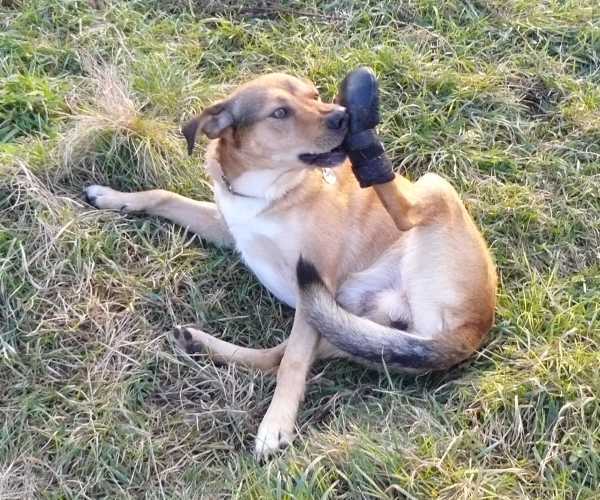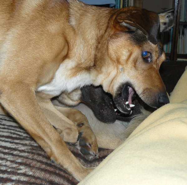 No i jeszcze końcowe kłapnięcie.Zwykle to Ruter jest prowodyrem zabaw , jednak Pixel mu to ułatwia wciskając się wszędzie i zazdrośnie domagając się pieszczot jeśli tylko poświęci się choć chwilę uwagi Ruterowi. Staramy się wszelkie dobra, także pieszczoty, rozdawać psiakom po równo dbają też aby te zwyczaje i miejsca Rutera do których jest przyzwyczajony nie uległy zmianie. Jednak wystarczy że Pixel zajmie na wersalce miejsce obok mnie zanim zrobi to Ruter a już Ruter rozpoczyna podchody. Na szczęście jak do tej pory tylko raz doszło do ostrego spięcia pomiędzy nimi i to na samym początku pobytu Pixela u nas. Od tego czasu zdarzało się co najwyżej tylko kilka warknięć ostrzegawczych i to tylko wtedy gdy któryś z nich miał coś cennego, na przykład kość lub zabawkę. Dlatego dbamy, aby nie zostawały razem samotnie w domu i miały do dyspozycji jakąś rzecz o którą mogłyby się pokłócić.