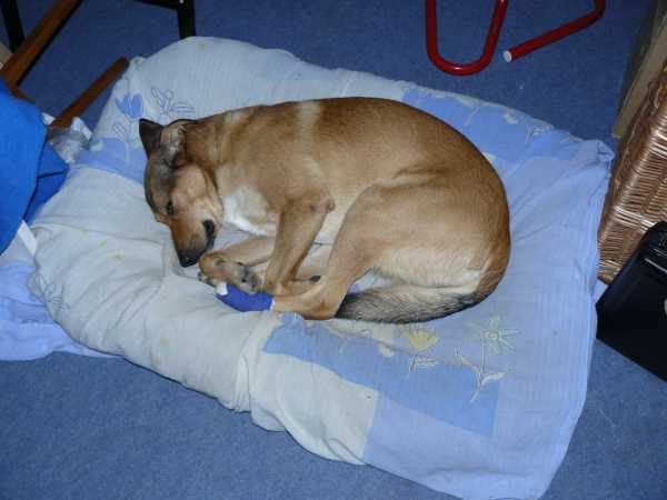 Późno w nocy Pixel wolał na spanie wybrać legowisko Rutera, tymczasowo przeniesione do mojego pokoju.Sobota (31 X)