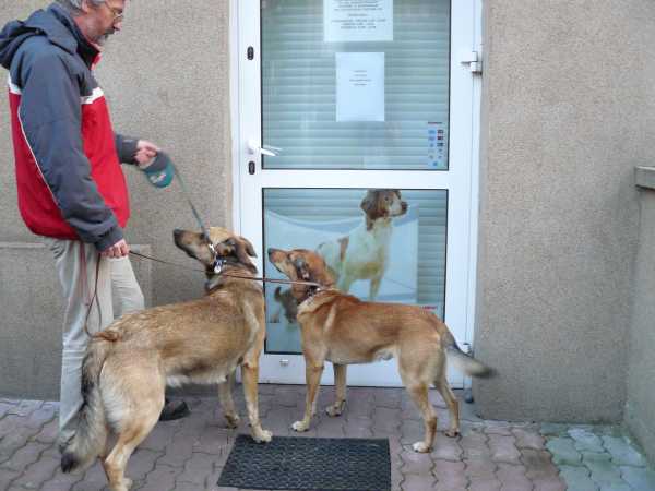 Co chwila podchodzi do Pixela, obwąchuje go i pociesza.W drodze powrotnej musieliśmy przejść koło weterynarza. Zwykle Ruter unika tego miejsca. Gdy tylko gabinet jest otwarty usiłuję wykorzystać okazję by zwarzyć Rutera lub Pixela. Jednak Ruter boi się tego miejsca od czasu pierwszej wizyty. Muszę zazwyczaj użyć siły by wprowadzić Rutera do gabinetu. Ostatnio kilka razy byliśmy tu z Pixelem i raz z Ruterem. To właśnie tutaj Pixel w tym miesiącu był na pierwszych oględzinach i szczepieniu. To właśnie tutaj byliśmy z nim także w tym tygodniu z powodu skaleczonej łapki.