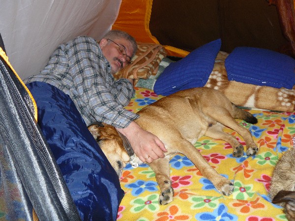 Poranek. Ruter oczekujący na wypuszczenie z namiotu.