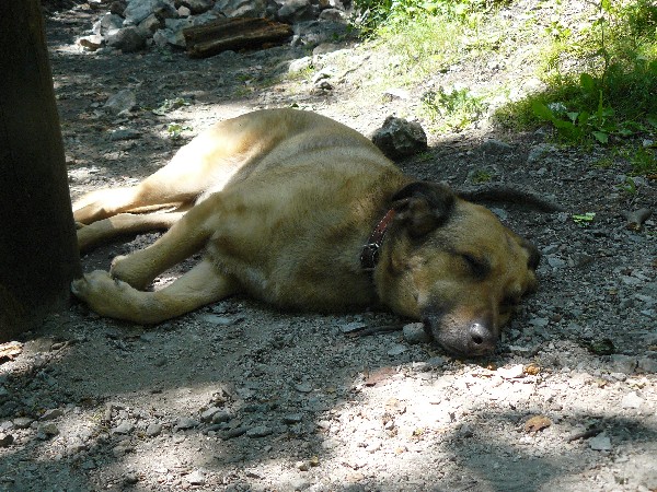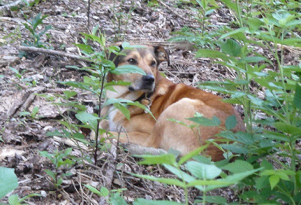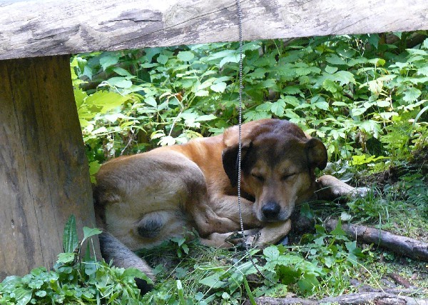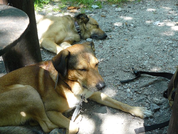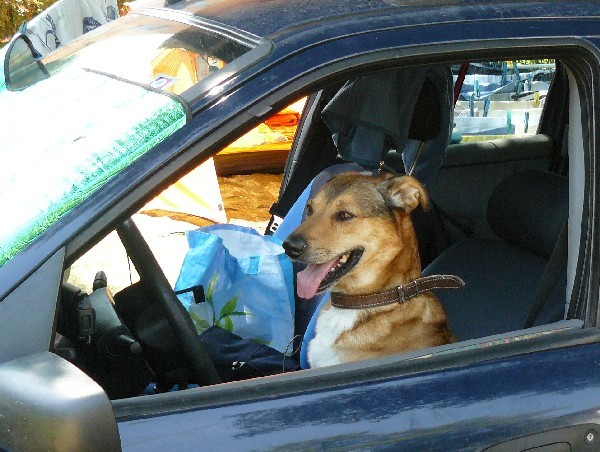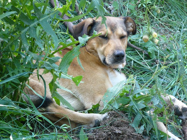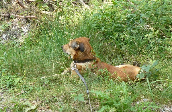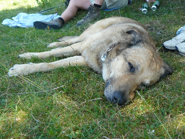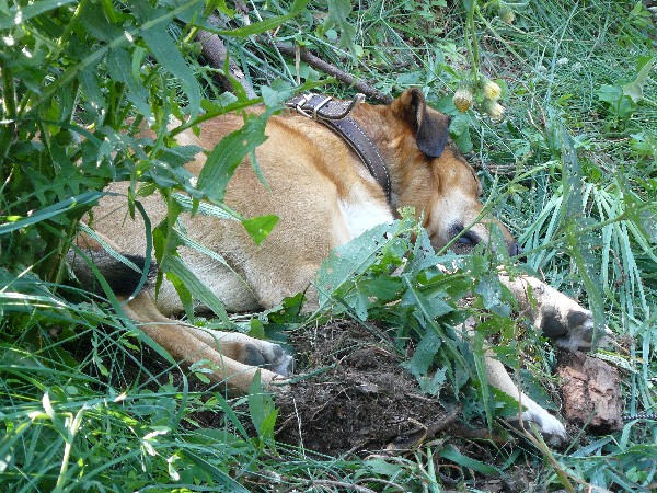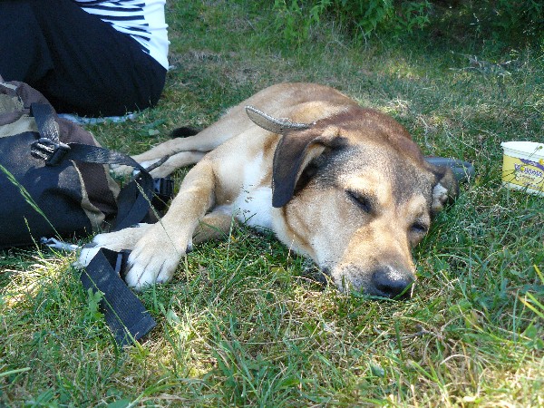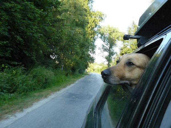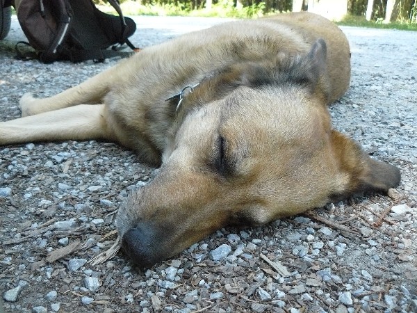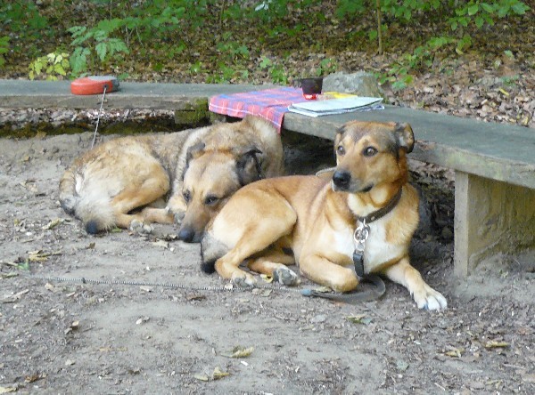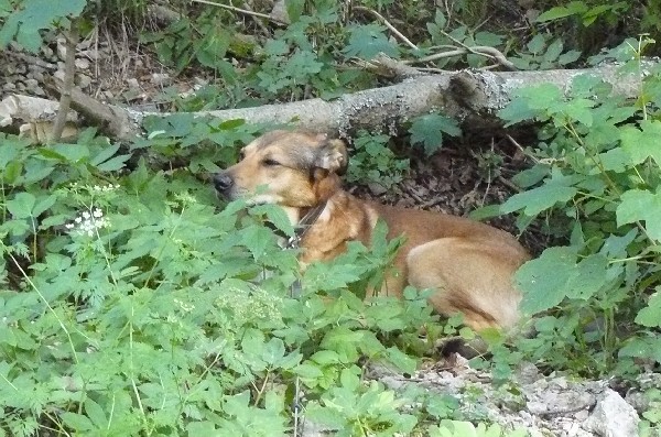 Już z powrotem na parkingu. Psiaki szukająochłody i odpoczynku. Pixel wybiera zarośla.