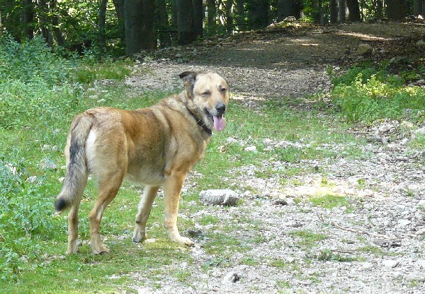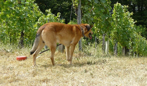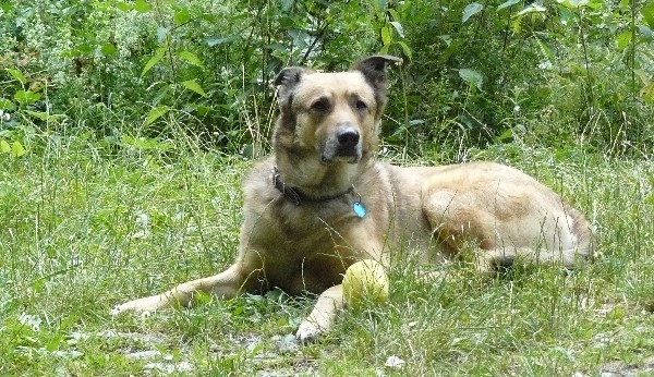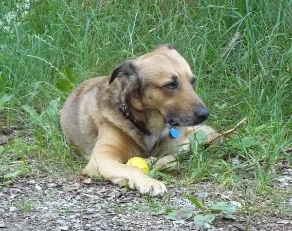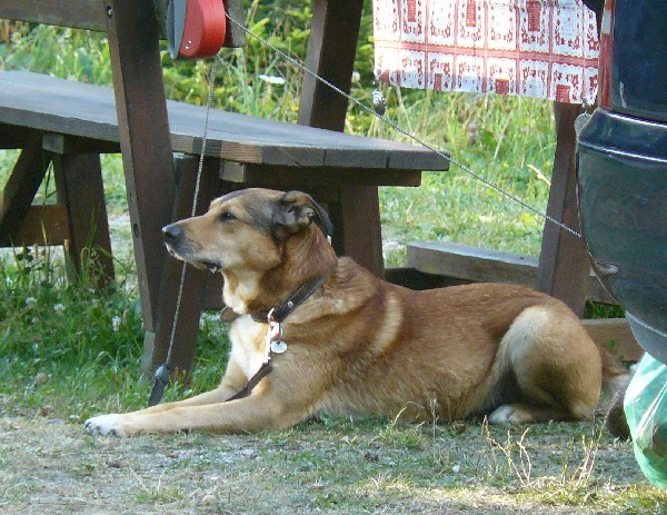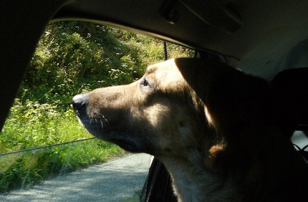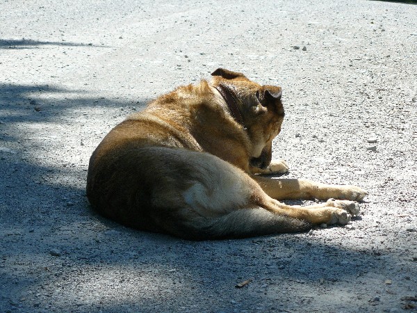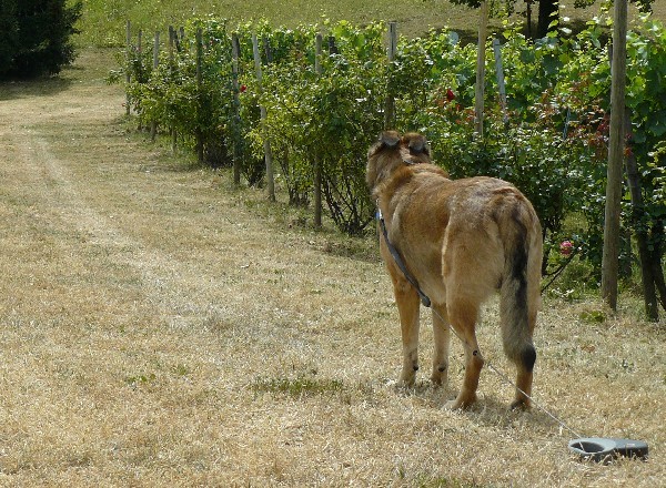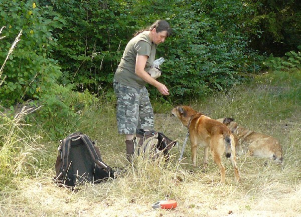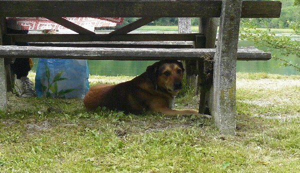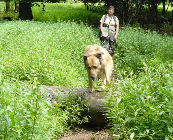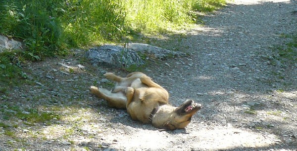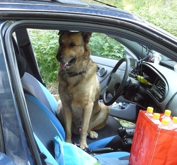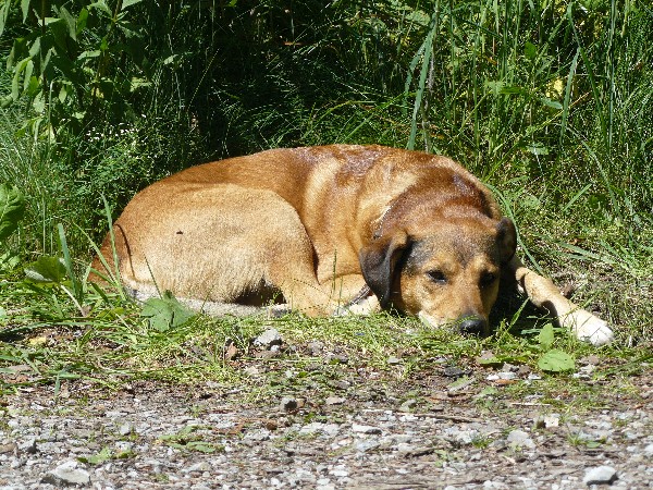 Już z powrotem na parkingu. Psiaki szukająochłody i odpoczynku. Pixel wybiera zarośla.
