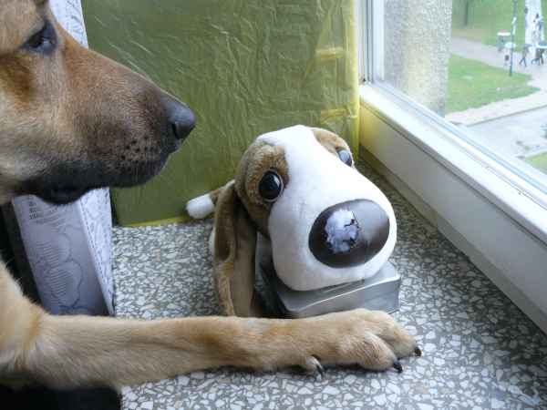 Tak się złożyło, że w korytarzu kontakt ten znalazł się na przeciwko legowiska Rutera i w dodatku mniej więcej na wysokości jego głowy. W okresie intensywnego swędzenia dziąseł Ruter upodobał sobie ten kontakt na tyle, że wyrwał go ze ściany. Niestety wszelkie doraźne środki w postaci zalepiania kontaktu nie pomogły, wręcz przeciwnie, plastry taśmy zachęcały go do jeszcze bardziej intensywnego odrywania. Pomogło dopiero zastawienie ściany dużą deską, właściwie ciężką półką wyjętą z jakiegoś regału. Ale ostatecznie Ruter przestał interesować się kontaktem dopiero wtedy, gdy półka kiedyś spadła na niego.
