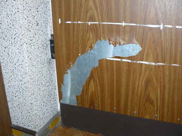 Okleina drzwi wejściowych interesowała Rutera od momentu, gdy zorientował się, że w kilku miejscach odstaje od nich fragment folii. Folię zdarł z nich w ciągu kilku dni wykorzystując do tego chwile naszej nieobecności. Niestety nie zorientowaliśmy się w tym od razu i Ruter po folii przystąpił do zdzierania okleiny. W przeciągu następnych kilku tygodni dziura powiększała się systematycznie a mnie brakowało pomysłu na zabezpieczenia drzwi przed takim efektem. Na szczęście ok kilku miesięcy dziura przestała się powiększać.