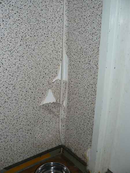 W zasadzie Ruter nie przejawiał nigdy zbytniego zainteresowania tapetą, jednak w kilku miejscach pozostawił na niej ślady po sobie. Jedno z takich miejsc to kąt nad miską z wodą. Pierwsze zadziory zobaczyłem w tym miejscu w maju. Przez dłuższy czas wydawało się, że to tylko jednorazowy wybryk. Później jednak zadziory się powiększały. Niestety od czasu do czasu stwierdzam, że powiększają się nadal.