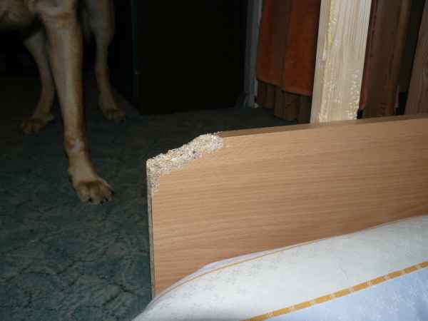 Niewielka deska stanowiąca niską boczną ściankę legowiska Rutera. Zamontowałem ją w okolicach maja w nadziei ochronienia Rutera przed drzwiami od kuchni. Po jakimś czasie okazało się, że Ruter korzysta z tej deski podobnie jak z koszyka wiklinowego, to znaczy służy mu za gryzak.