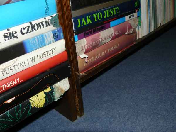Jednak ze ścian w moim pokoju to regały z książkami. Gdy Ruterowi nie chce się przeciskać pomiędzy komputerem a wersalką na swoje najbardziej ulubione miejsce, to kładzie się pomiędzy wersalką a regałem. Niestety, nie wychodzi to na dobre książkom. Gdy się zorientowałem co Ruter z nimi wyczynia kilka z nich przyjęło już opłakany wygląd.