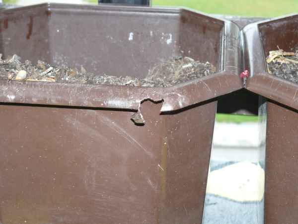Doniczki na balkonie są plastikowe, pomimo to jakoś nie znalazły się w centrum uwagi Rutera. Jeśli się do nich zbliżał to raczej po to, by w nich pogrzebać i rozkopać znajdującą się w nich ziemię - co czynił zwykle z wielką ochotą. Jednak jakiś czas potem zauważyliśmy, że jedna z nich też doświadczyła zębów Rutera.