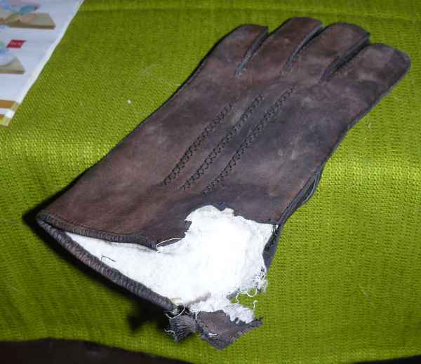 Zniszczona rękawiczka.No i wystarczyła jedna popołudniowa kilkunastominutowa drzemka, by Ruter znudzony zainteresował się nowym nieznanym mu przedmiotem. Przebudzenie było mało przyjemne. W pobliżu legowiska Rutera z daleka zobaczyłem jakieś strzępy. W samym legowisku znajdowała się rękawiczka, a przy niej zadowolony Ruter jeszcze przeżuwający jakiś jej fragment. Niestety, rękawiczki nadają się już tylko do wyrzucenia.